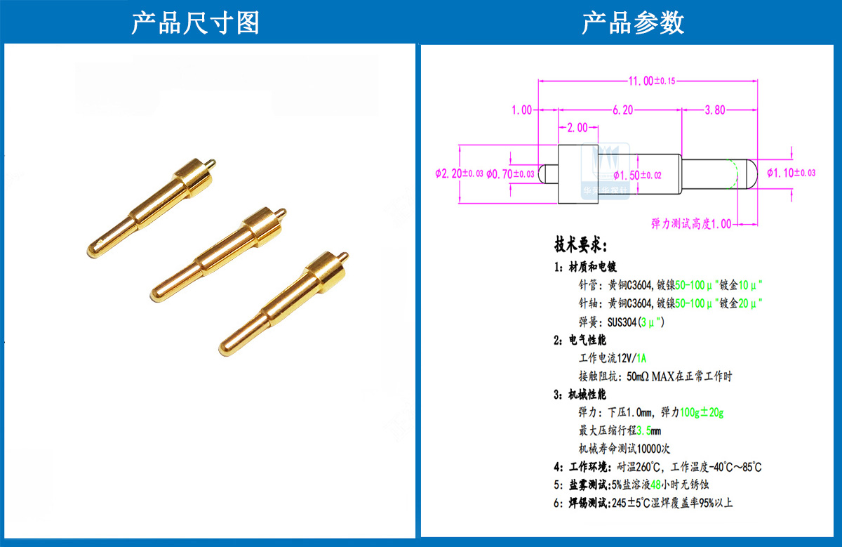 產(chǎn)品頭型:探針外徑為1.5mm,總長度為11mm、針的兩端的頭型為圓頭