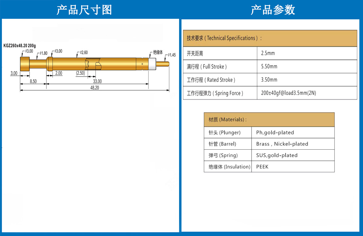 產(chǎn)品簡介:KGZ260探針、2.60mm測試針、總長48.20mm、彈簧針、測試針