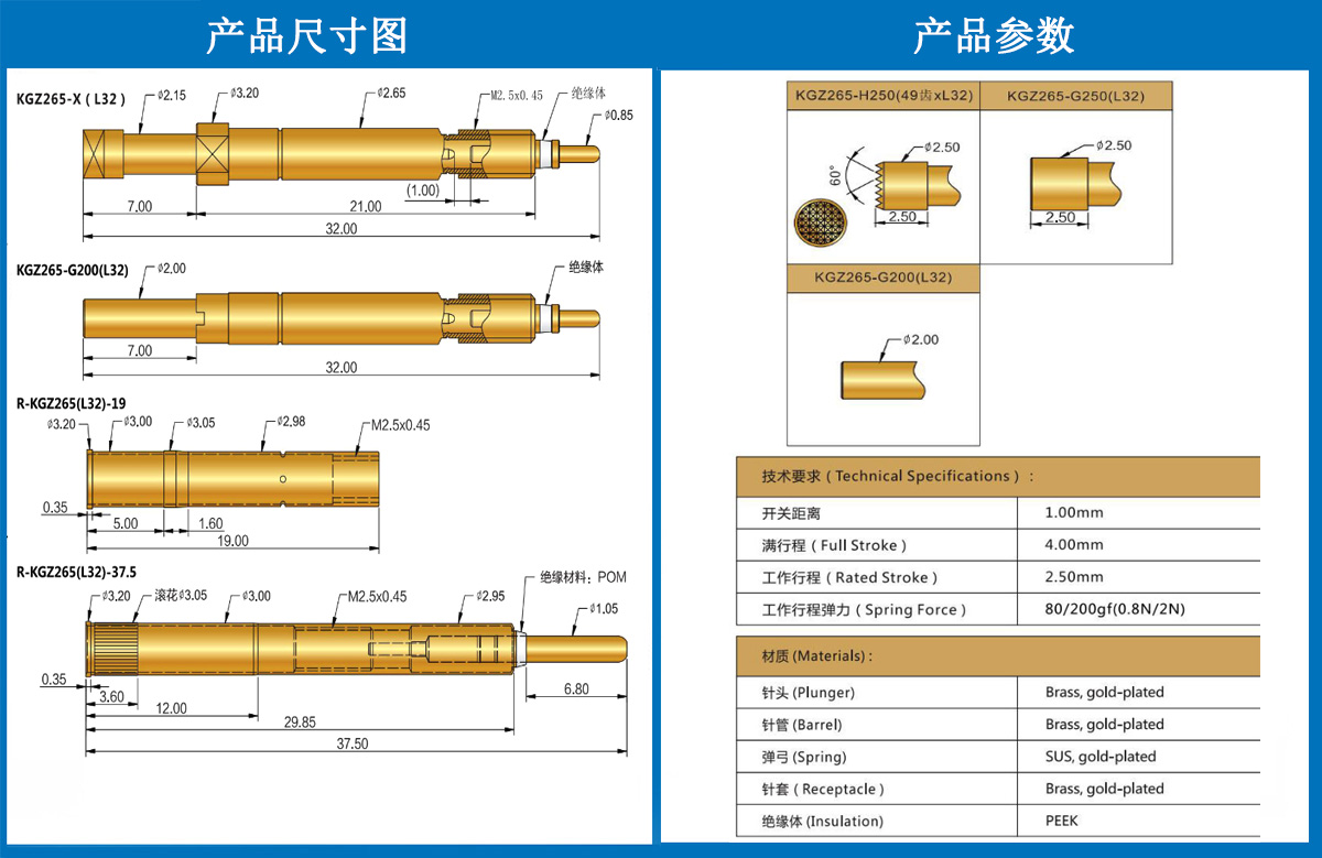 產(chǎn)品簡介:KGZ265(L32)探針、2.65mm測試針、總長32mm、彈簧針、測試針
